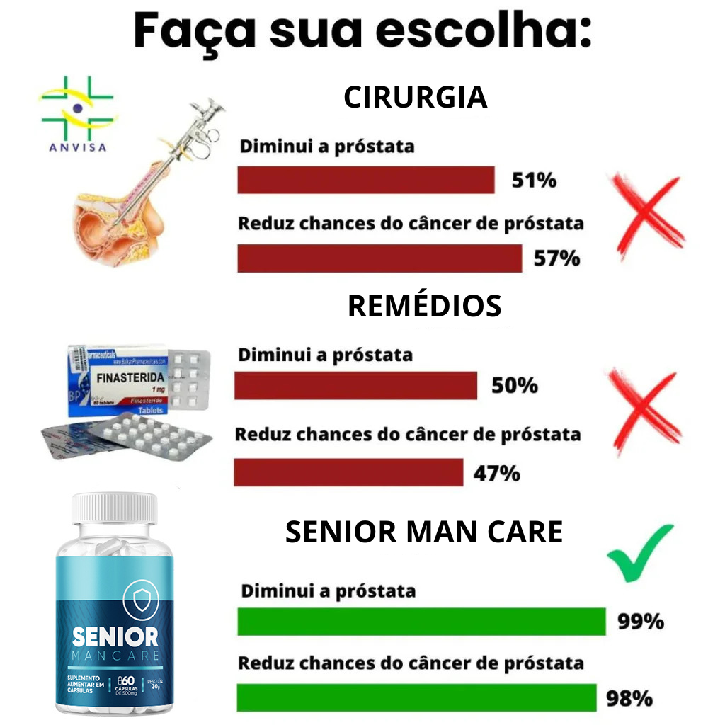 Este produto não se destina a diagnosticar, tratar, curar ou prevenir qualquer doença, os resultados podem variar de pessoa para pessoa, esses depoimentos podem ser reais ou fictícios, esta informação não constitui aconselhamento médico e não deve ser considerada como tal, consulte o seu médico antes de modificar sua dieta regular. Este é um advertorial e não um artigo de notícia ou blog. Produto dispensado da obrigatoriedade de registro conforme RDC 240/2018. O Senior Man Care não apoia a automedicação. ©2024 O Senior Man Care