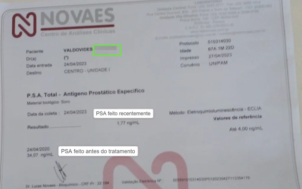 Seu PSA estava marcando 1,77 ng/mL. Resultados que dariam em homens de 30 anos. Foi um resultado espetacular.